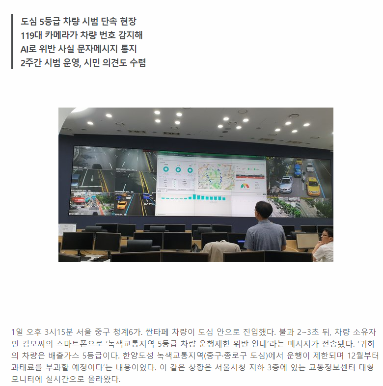 (서울=뉴스1) 홍기삼 기자 = 1일 오후 서울시청 지하3층 서울교통정보센터(TOPIS) 상황실. 대형 스크린에는 서울 종로구와 중구 등 '녹색교통지역'에 진입한 배출가스 5등급 차량 번호판이 실시간으로 추출돼 표시되고 있었다.